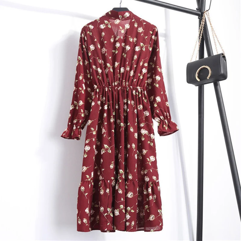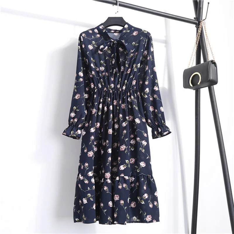 price reduction Women Casual Autumn Dress Lady Korean Style Vintage Floral Printed Chiffon Shirt Dress Winter Long